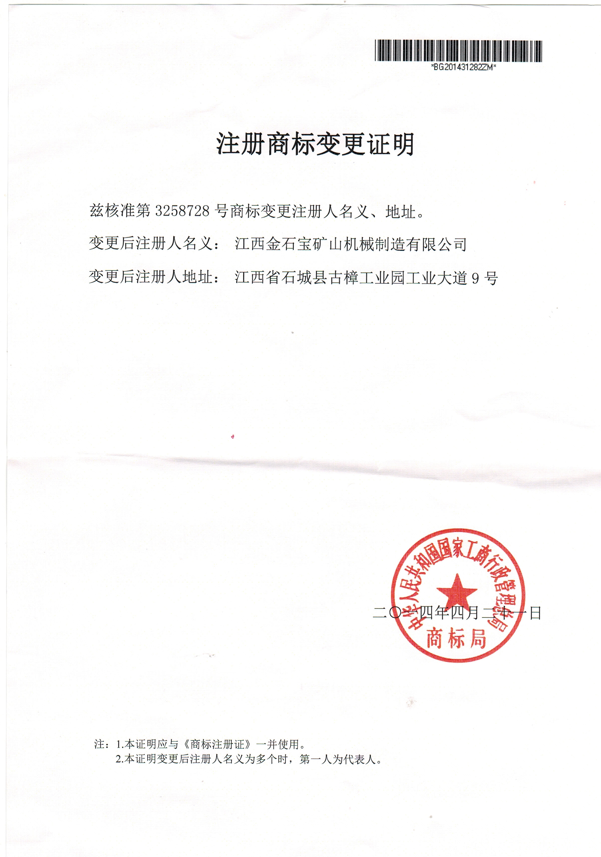 商标注册变更证书