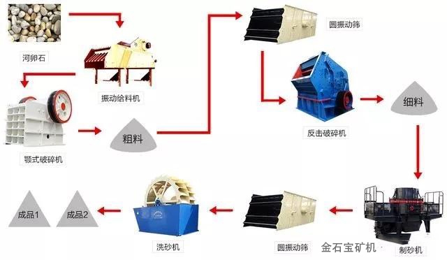 e.颚式破碎机+圆锥式破碎机+冲击式制砂整形机或制砂系统(常见)。